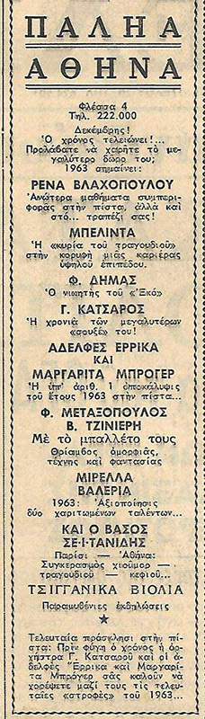Βλαχοπούλου - Μπελίντα - Κατσαρός - Σεϊτανίδης συνεργάζονται εκ νέου στην "Παλιά Αθήνα" τη σεζόν 1963-64 και παρουσιάζουν τις ρεβί πίστας "Κομπολόι ηθοποιών" (όπου η Βλαχοπούλου υποδύεται