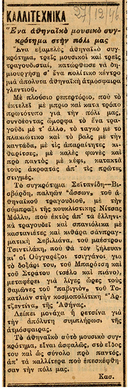 Ρεπορτάζ για παράσταση στην Πόλη, το 1946 (κάν'τε κλικ για να δείτε μεγαλύτερο μέγεθος). Ανακοίνωση για την "Παληά Αθήνα", 1963 (κάν'τε κλικ για να δείτε μεγαλύτερο μέγεθος). Ανακοίνωση για τη Βεράντα της Καστέλλας. Ανακοίνωση για τις Κερασιές.